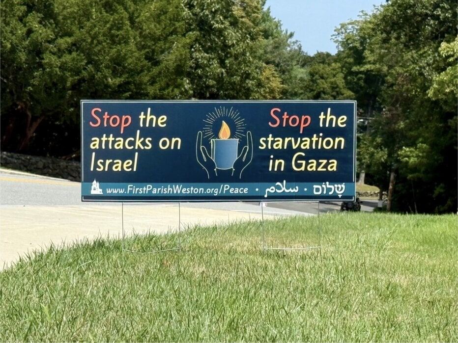 Why did we once again place this sign about Israel and Gaza on our front lawn?