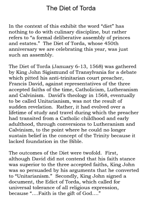 In 2018, on the occasion of the 450th anniversary of the Edict of Torda, First Parish celebrated the event with a display in the Mary Jo Rines Art Gallery depicting the first 28 years of the Torda-First Parish relationship. What follows is that display, in modified form.