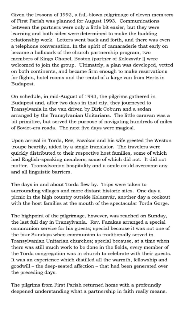 Following a model first implemented after World War I, the Unitarian-Universalist Association in the Unites States resurrected a “Sister Church” program which paired American and Canadian congregations with churches in cities, towns, and villages in Transylvania. First Parish Church in Weston was honored by being partnered with the Unitarian Church in the large town of Torda, the location where the “founding document” of Unitarianism, the Edict of Torda, was promulgated in 1568.